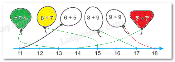- Tính nhẩm kết quả các phép cộng ghi trên mỗi quả bóng rồi nối với số tương ứng trên tia số.