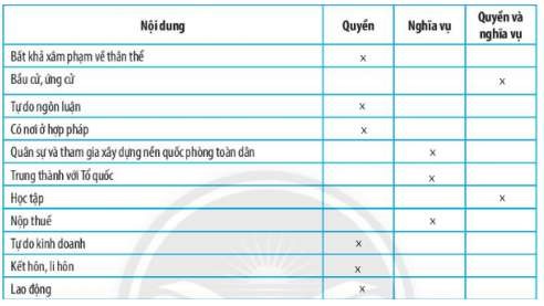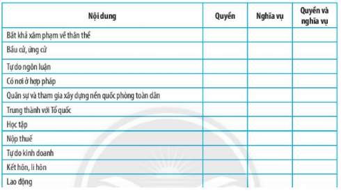 Em hãy đọc các nội dung và phân loại các nội dung vào quyền phù hợp.