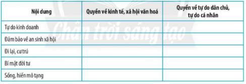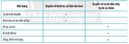 Học sinh điền những nội dung vào các quyền về kinh tế, xã hội văn hóa và quyền tự do dân chủ, tự do cá nhân.