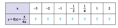 \(y = f\left( x \right) = \dfrac{5}{{4x}}\) |