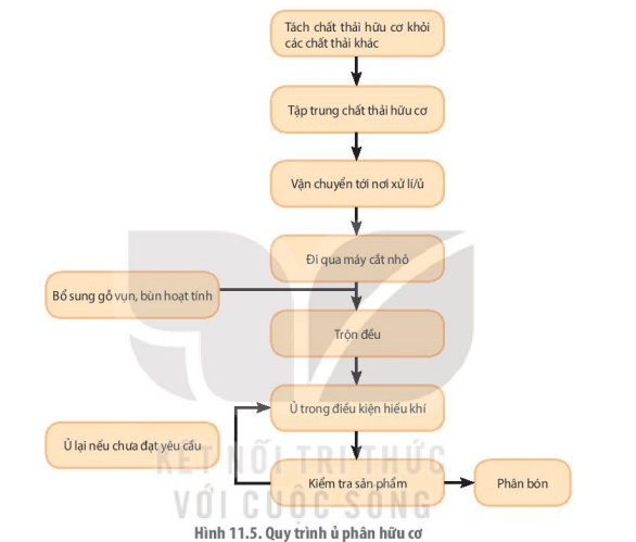 Dựa vào thông tin về quy trình ủ phân hữu cơ, kết hợp quan sát sơ đồ hình 11.5, em hãy chỉ ra các ưu điểm và nhược điểm có thể có của quá trình xử lí chất hữu cơ trong điều kiện hiếu khí theo sơ đồ đó.