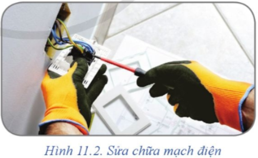 Quan sát Hình 11.2 và cho biết người thợ trong tình huống này đã sử dụng những dụng cụ bảo vệ an toàn điện nào? Hãy nêu cách sử dụng những dụng cụ này sao cho đúng cách và đảm bảo an toàn.
