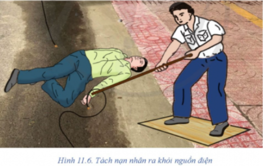 Hãy kể tên các dụng cụ an toàn điện được sử dụng trong Hình 11.6 để tách nạn nhân ra khỏi nguồn điện.