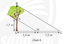 a) Độ cao \(AN\) và chiều dài bóng nắng của các đoạn thẳng \(AN,BN\) trên mặt đất được ghi lại như trong Hình 6. Tính chiều cao \(AB\) của cái cây.