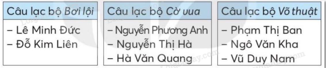 - Câu lạc bộ Cờ vua có 3 bạn đăng kí là: Nguyễn Phương Anh, Nguyễn Thị Hà, Hà Văn Quang.