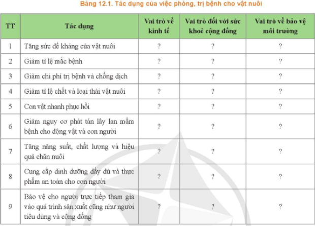 Hãy lựa chọn ô trong bảng 12.1 phù hợp với tác dụng của việc phòng, trị bệnh cho vật nuôi.