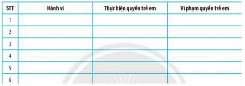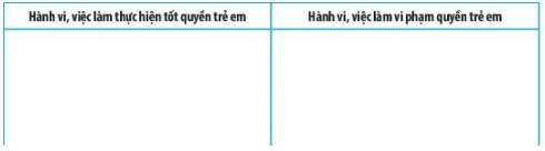 Nêu những hành vi, việc làm thực hiện quyền trẻ em và vi phạm quyền trẻ em trong gia đình, nhà trường, xã hội theo bảng gợi ý dưới đây.