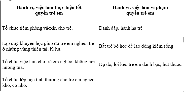 Học sinh sắp xếp các hành vi, việc làm dưới đây vào bảng, phân biệt hành vi việc làm thực hiện tốt quyền trẻ em và chưa thực hiện đúng quyền trẻ em.