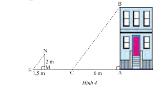 Bóng của một căn nhà trên mặt đất có độ dài 6 m. Cùng thời điểm đó, một cọc sắt cao 2 m cắm vuông góc với mặt đất có bóng dài 1,5m (Hình 4). Tính chiều cao của ngôi nhà.