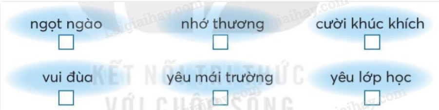 Em đọc kĩ bài đọc trong sách giáo khoa và tích vào ô trống dưới những từ ngữ thể hiện rõ nhất tình cảm của bạn nhỏ dành cho trường lớp.