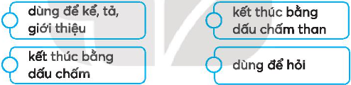 Xếp các câu kể trong đoạn dưới đây vào nhóm thích hợp. Đánh dấu tích vào ô trống trước những thông tin đúng về câu kể. Xếp các câu dưới đây vào nhóm thích hợp và giải thích lí do xếp như vậy. Điền dấu chấm, dấu chấm hỏi hoặc dấu chấm than vào ô trống. Đặt câu kể với từ ngữ cho trước. Viết lời giải cho các câu đố dưới đây.