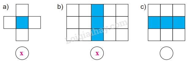 Viết dấu “x” vào ô trống dưới hình đã tô màu $\frac{1}{5}$ số ô vuông của hình đó.