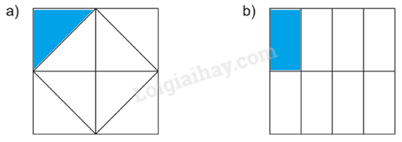 a) Hình a gồm 5 ô vuông, tô màu 1 ô vuông. Vậy đã tô màu $\frac{1}{5}$ hình a.