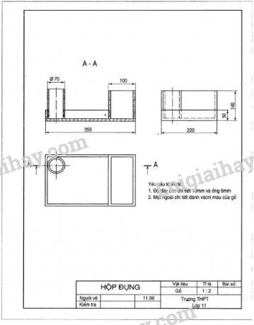 Sau đó tính toán, xác định hình dạng, kích thước và lập bản vẽ của hộp đựng như hình sau.