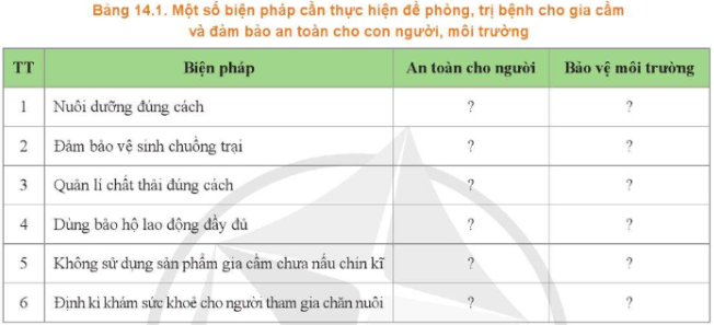 Hãy lựa chọn các biện pháp cần thực hiện trong quá trình nuôi dưỡng, chăm sóc và phòng, trị bệnh gia cầm để đảm bảo an toàn cho con người và môi trường theo mẫu bảng 14.1
