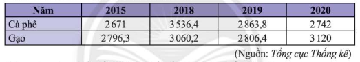 Giá trị (triệu USD) xuất khẩu cả phê và gạo của Việt Nam trong các năm 2015, 2018, 2019, 2020 được cho trong bảng thống kê sau: