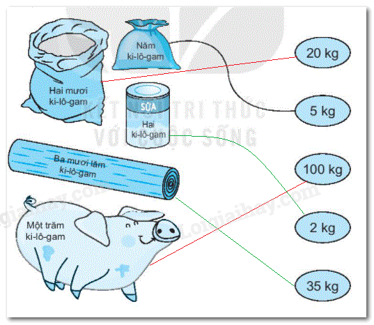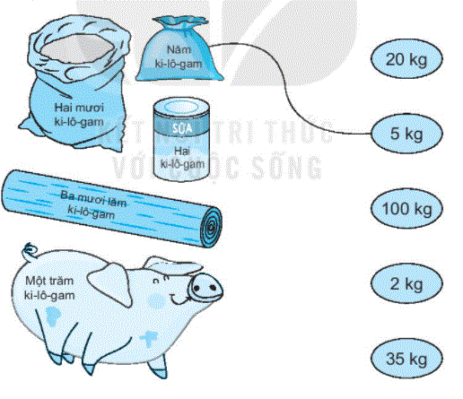 Quan sát tranh vẽ, đọc số ki-lô-gam ở bên trái rồi nối với số tương ứng ở bên phải cho thích hợp.