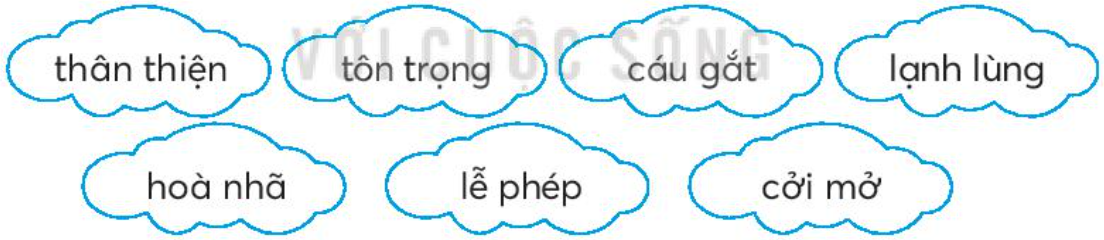 Những từ ngữ chỉ thái độ lịch sự trong giao tiếp là: thân thiên, tôn trọng, hòa nhã, lễ phép, cởi mở.