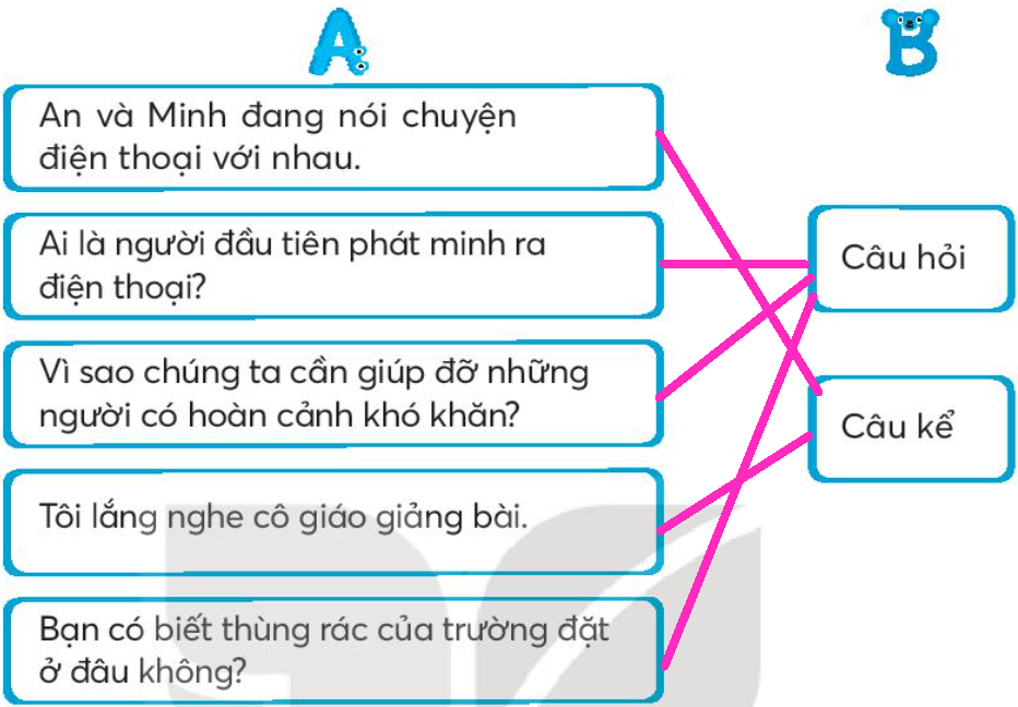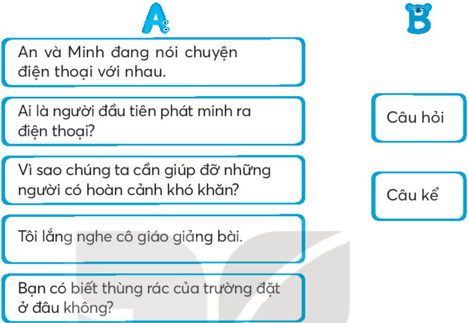 Nối câu ở cột A với kiểu câu thích hợp ở cột B.