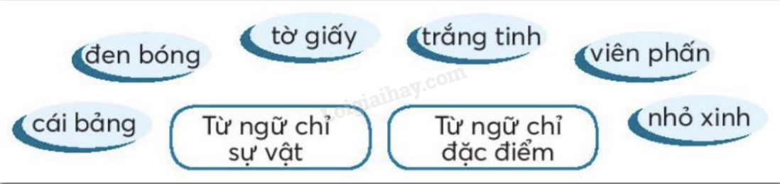 - Từ ngữ chỉ sự vật: cái bảng, tờ giấy, viên phấn