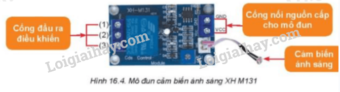 Quan sát Hình 16.4 và xác định vị trí cổng đầu vào nguồn cấp và cổng đầu ra điều khiển của mô đun cảm biến ánh sáng.