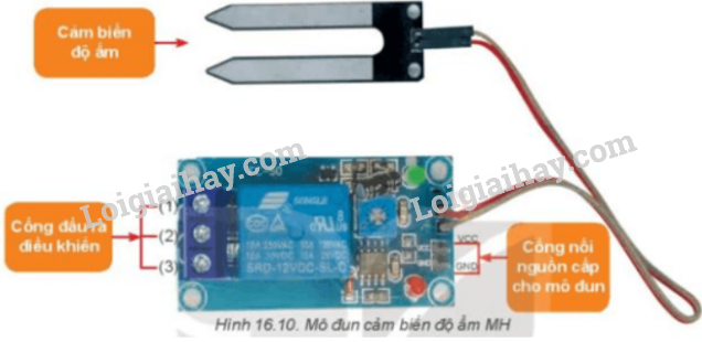 Quan sát Hình 16.10 và xác định vị trí cổng đầu vào nguồn cấp và cổng đầu ra điều khiển mô đun cảm biến độ ẩm.