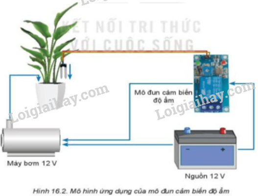 Quan sát Hình 16.11 và nêu tên các thành phần chính của mạch điện điều khiển máy bơm sử dụng mô đun cảm biến độ ẩm.