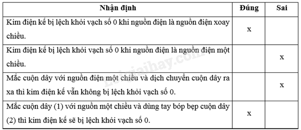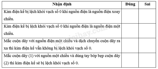 - Mắc cuộn dây với nguồn điện một chiều và dịch chuyển cuộn dây ra xa thì kim điện kế vẫn không bị lệch khỏi vạch số 0 là sai vì khi dịch chuyển cuộn dây thì từ thông qua cuộn dây biến thiên.