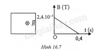 Một khung dây cứng, phẳng diện tích 25 cm2, gồm 10 vòng dây. Khung dây được đặt trong từ trường đều. Khung dây nằm trong mặt phẳng như Hình 16.7. Cảm ứng từ biến thiên theo thời gian theo đồ thị.