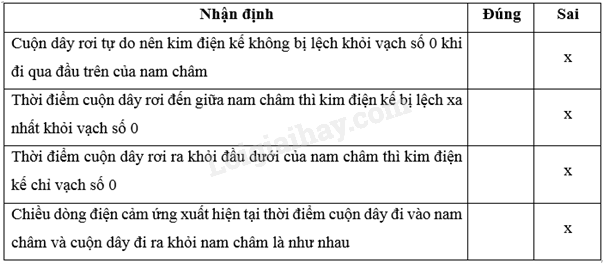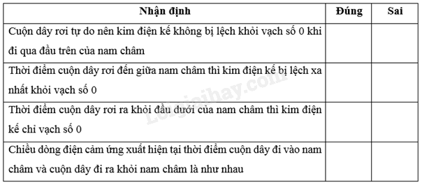 - Thời điểm cuộn dây rơi ra khỏi đầu dưới của nam châm thì kim điện kế bị lệch nhiều nhất.