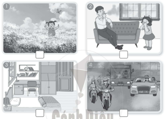 Đánh dấu x vào ô trống dưới hình cho biết không khí ở đó chứa nhiều khói, bụi.