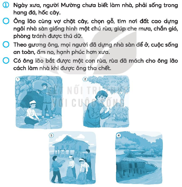 3. Ông lão cùng vợ chặt cây, chọn gỗ, tìm nơi đất cao dựng ngôi nhà sàn giống hình một chú rùa, giúp che mưa, chắn gió, phòng tránh được thú dữ.