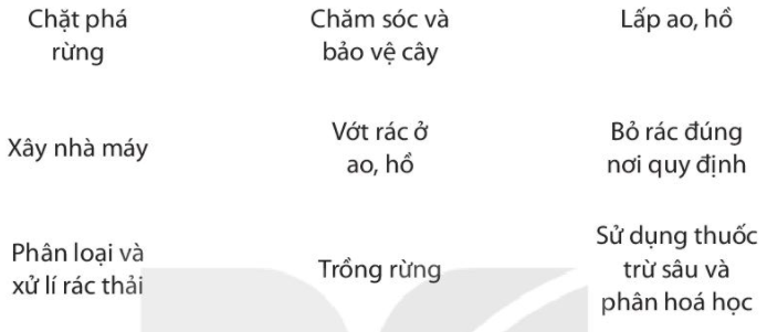 Khoanh bằng bút màu xanh vào các cụm từ chỉ việc làm có lợi, màu đỏ vào các cụm từ chỉ việc làm có hại cho mỗi trường sống của thực vật và động vật.