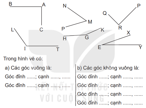 Dùng ê ke để kiểm tra góc vuông rồi viết tiếp vào chỗ chấm cho thích hợp.