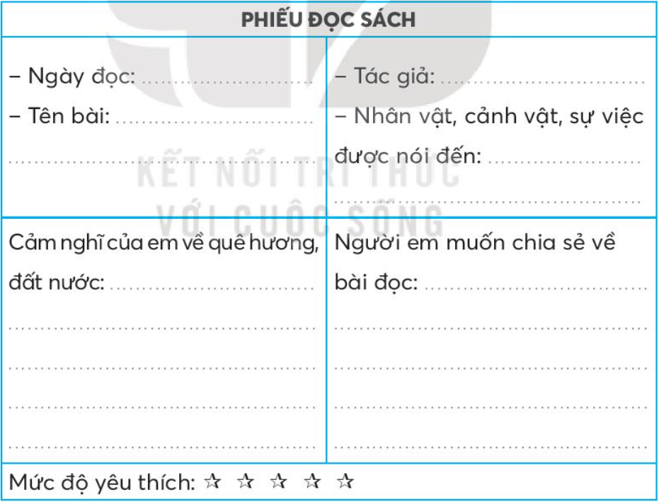 Đọc bài Cửa Tùng hoặc tìm đọc câu chuyện, bài văn, bài thơ,... về quê hương, đất nước và viết thông tin vào phiếu đọc sách.