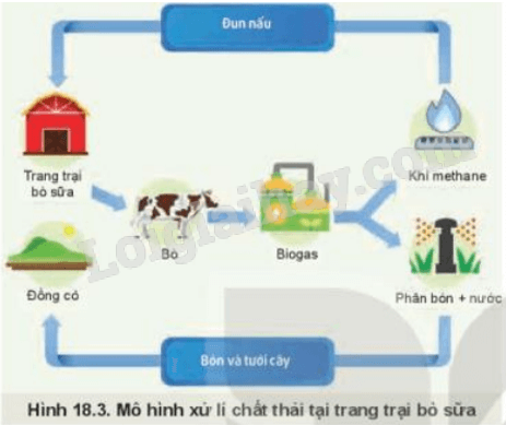 Quan sát Hình 18.3 và mô tả mô hình xử lý chất thải trong chăn nuôi bò sữa theo tiêu chuẩn VietGAP.