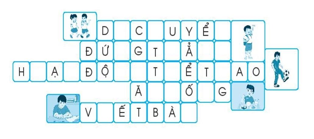 Nhờ có cơ quan vận động, chúng ta có thể làm được những việc gì? Quan sát hình và viết những chữ cái vào ô chữ để trả lời cho câu hỏi trên.
