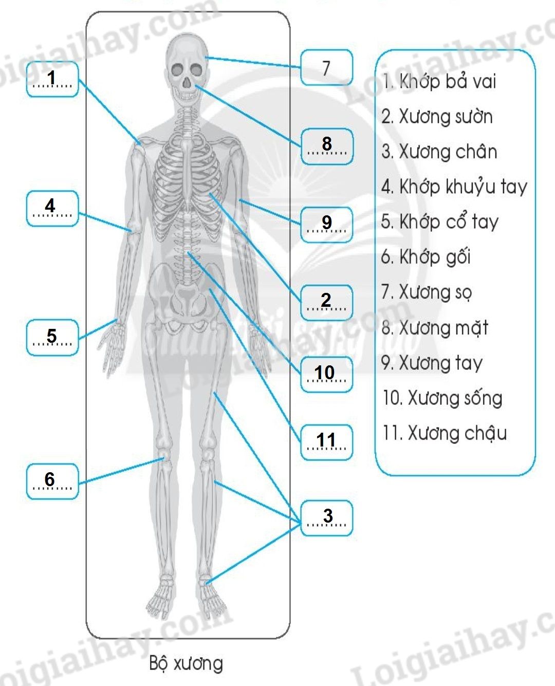 Điền số vào chỗ (…) sao cho tên gọi phù hợp với vị trí của mỗi xương hoặc khớp xương trong hình (theo mẫu).
