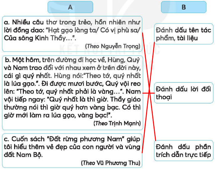 Dấu ngoặc kép trong những câu dưới đây dùng để làm gì? Nối câu ở cột A với công dụng của dấu ngoặc kép ở cột B.