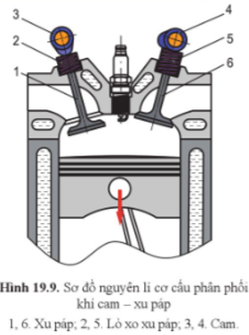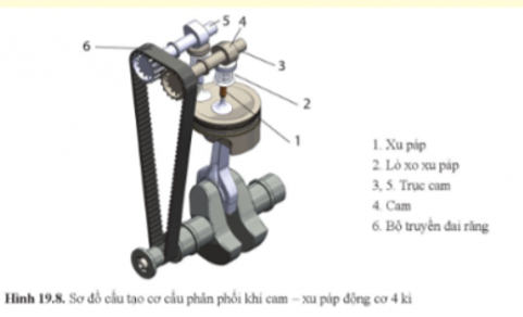 Quan sát hình 19.8 và chỉ ra các bộ phận chính của cơ cấu phân phối khi cam - xu páp động cơ 4 kì?