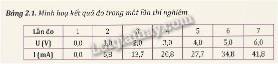 - Điều chỉnh máy phát âm tần để giá trị điện áp hiệu dụng ở hai đầu đoạn mạch tăng từ 0 V đến 6 V (Bước 0,5 V). Đọc giá trị cường độ dòng điện.