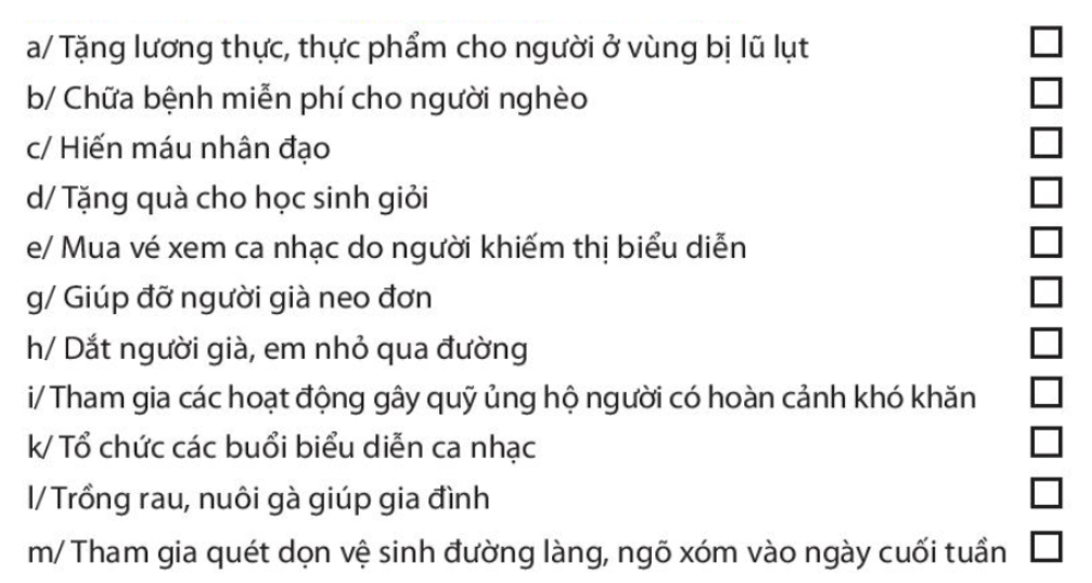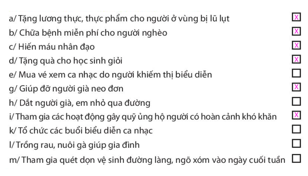 Hoạt động nào dưới đây là hoạt động thiện nguyện. Đánh dấu X vào ô trống ở những phương án em chọn. Viết nội dung phù hợp vào các ô trong bảng sau. Gần nhà Hải có một gia đình bác thương binh có hai con đều bị nhiễm chất độc màu da cam, cuộc sống rất khó khăn chật vật.