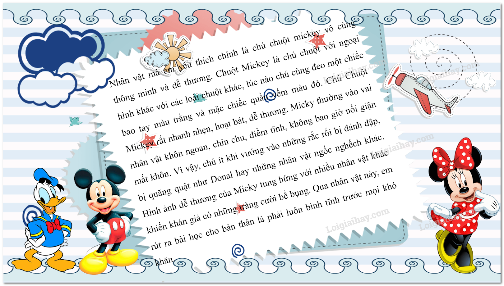 Nhân vật mà em yêu thích chính là chú chuột mickey vô cùng thông minh và dễ thương. Chuột Mickey là chú chuột với ngoại hình khác với các loài chuột khác, lúc nào chú cùng đeo một chiếc bao tay màu trắng và mặc chiếc quần yếm màu đỏ. Chú Chuột Mickey rất nhanh nhẹn, hoạt bát, dễ thương. Mickey thường vào vai nhân vật khôn ngoan, chỉn chu, điềm tĩnh, không bao giờ nổi giận mất khôn. Vì vậy, chú ít khi vướng vào những rắc rối bị đánh đập, bị quăng quật như Donal hay những nhân vật ngốc nghếch khác. Hình ảnh dễ thương của Mickey tung hứng với nhiều nhân vật khác khiến khán giả có những tràng cười bể bụng. Qua nhân vật này, em rút ra bài học cho bản thân là phải luôn bình tĩnh trước mọi khó khăn.