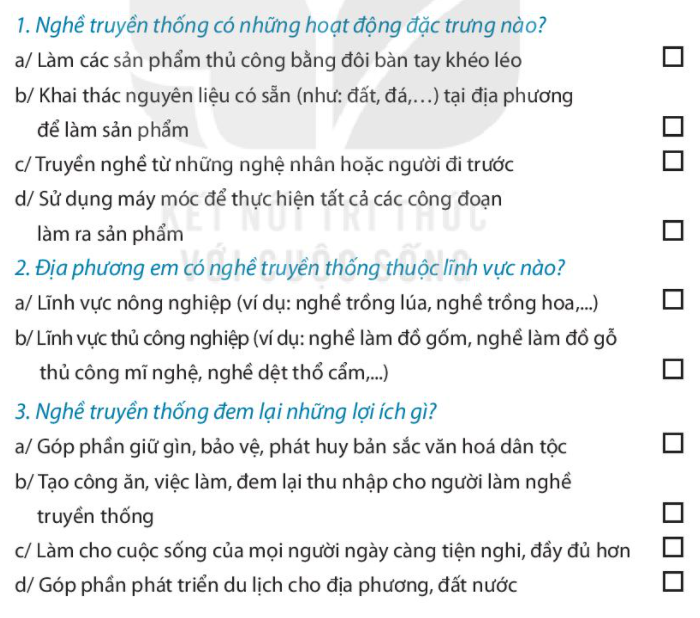 Đánh dấu X vào ô trống ở những phương án em chọn. Em hãy điền kế hoạch tìm hiểu một nghề truyền thống vào chỗ trống dưới đây. Ghi nội dung phỏng vấn người làm nghề truyền thống mà em và các bạn trong nhóm đã thiết kế được vào bảng dưới đây. Trình bày kết quả tìm hiểu về một nghề truyền thống và những cảm nhận của em về nghề truyền thống đó.