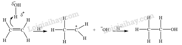- Cơ chế phản ứng khi cho ethylene tác dụng với H2O (xúc tác H+):
