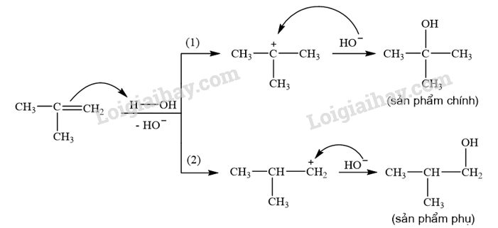 Hướng (1) tạo carbocation bậc II, hướng (2) tạo carbocation bậc I. Do đó hướng (1) tạo sản phẩm chính, hướng (2) tạo sản phẩm phụ.