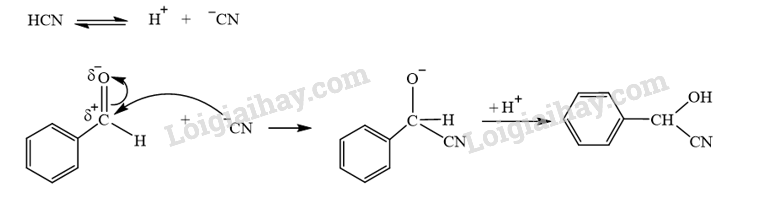 Phản ứng hoá học giữa benzaldehyde và HCN xảy ra theo cơ chế cộng nucleophile (AN).