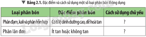 Hãy cho biết cách sử dụng chủ yếu (bốn thức, bón lót) của các loại phân bón được đề cập trong Bảng 2.1.Giải thích