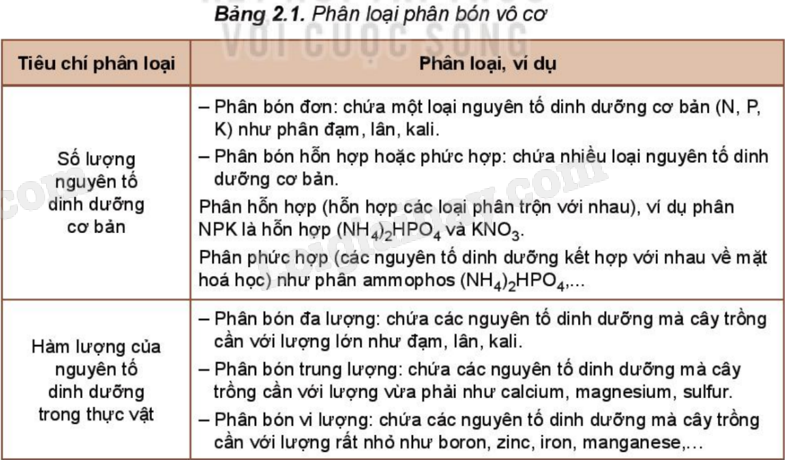 Dựa vào kiến thức trong bảng 2.1: Phân loại phân bón vô cơ