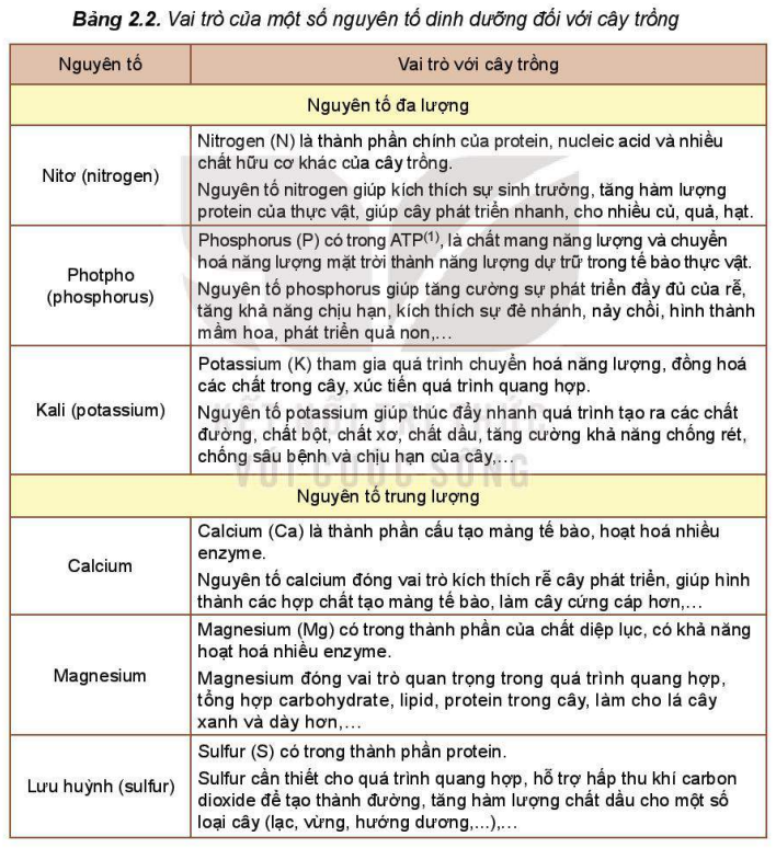 Dựa vào kiến thức trong bảng 2.2: Vai trò của một số nguyên tố dinh dưỡng đối với cây trồng